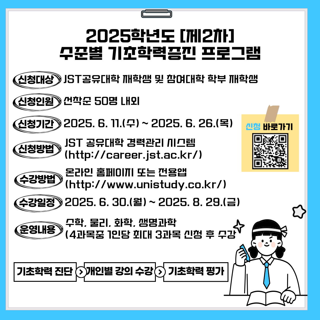 2025학년도 JST공유대학 [제2차] 수준별 기초학력증진 프로그램 참여 학생을 모집합니다.