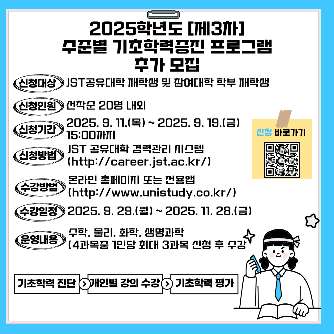 [마감] 2025학년도 JST공유대학 [제3차] 수준별 기초학력증진 프로그램 추가 모집