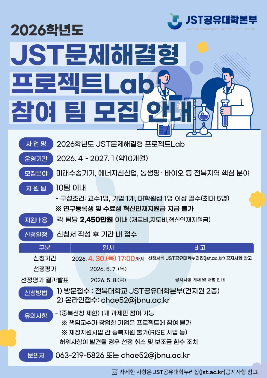 2026학년도 JST문제해결형 프로젝트Lab 참여 팀을 모집하오니 많은 지원 바랍니다.