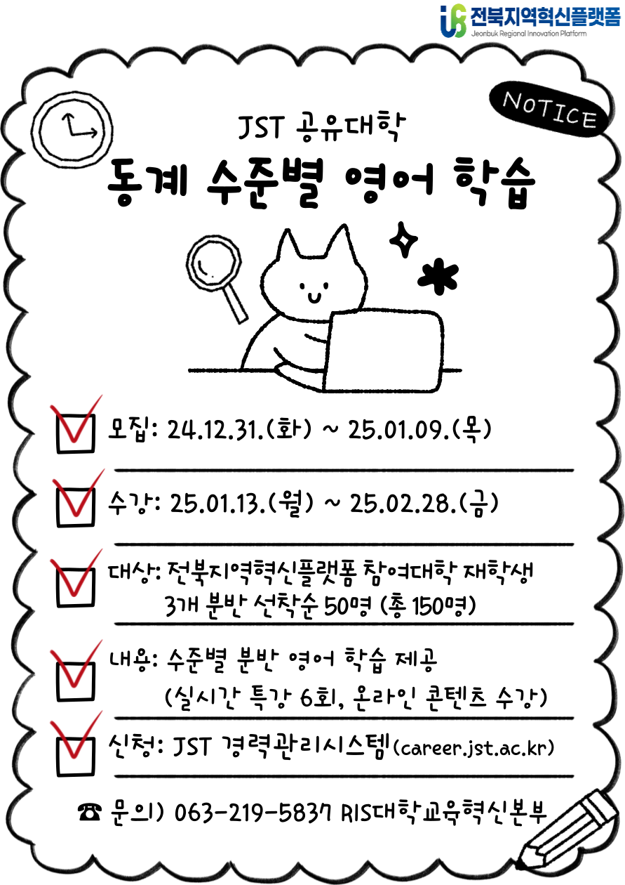 2024학년도 JST 공유대학 동계 수준별 영어학습 프로그램 참여 학생을 모집합니다.