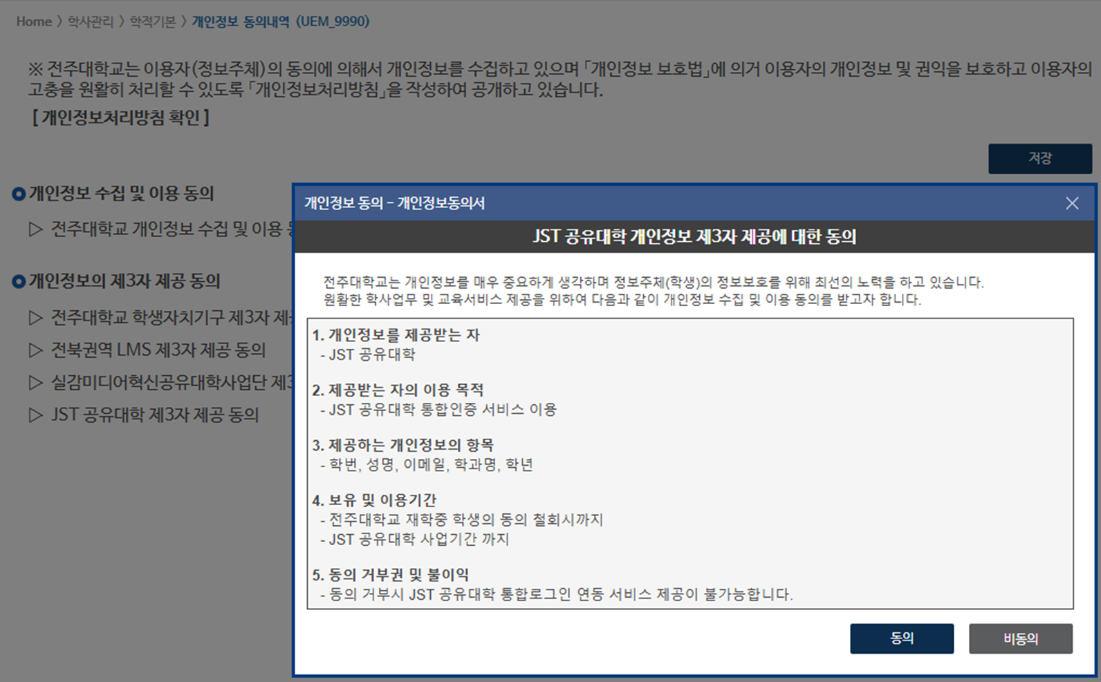 전주대학교-로그인-학사관리-학적기본-개인정보 동의내역-JST공유대학(선택)-제3자 정보 제공에 대한 동의 선택(필수)