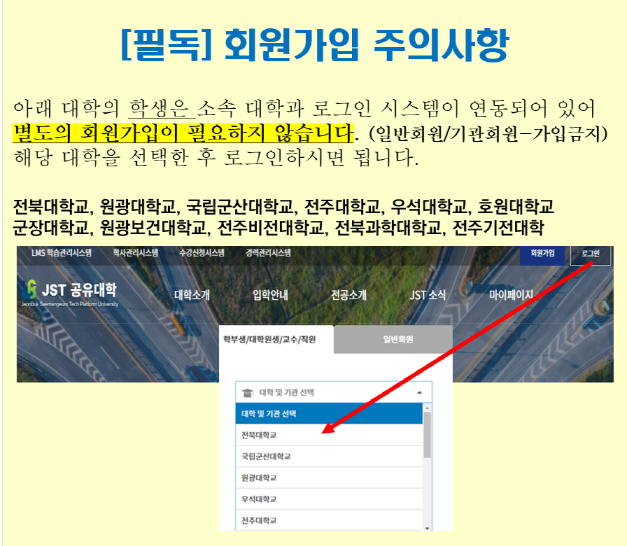 JST 공유대학 홈페이지 로그인 시, 본인의 소속 대학을 선택한 후 본인 소속대학의 아이디와 비밀번호를 입력하면 자동 로그인 됩니다.