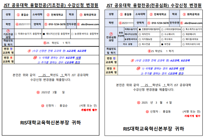 * 서식: JST 공유대학 누리집 – JST 소식 – 자료실 – 수강신청 변경신청서(기초전공/전공심화)
